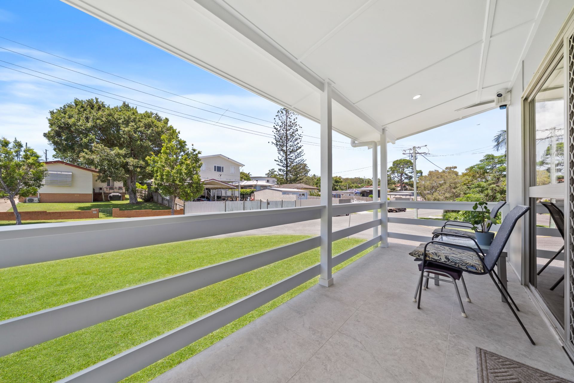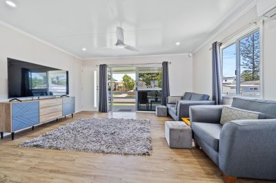 Upstairs, natural light and cooling bay breezes drift through the open living, dining, and kitchen space, creating an inviting heart of the home. The front covered veranda extends the living outdoors, offering the perfect spot for morning coffee or a relaxed afternoon unwind. All three bedrooms are generously sized, with the oversized master providing an impressive bank of built-in robes.